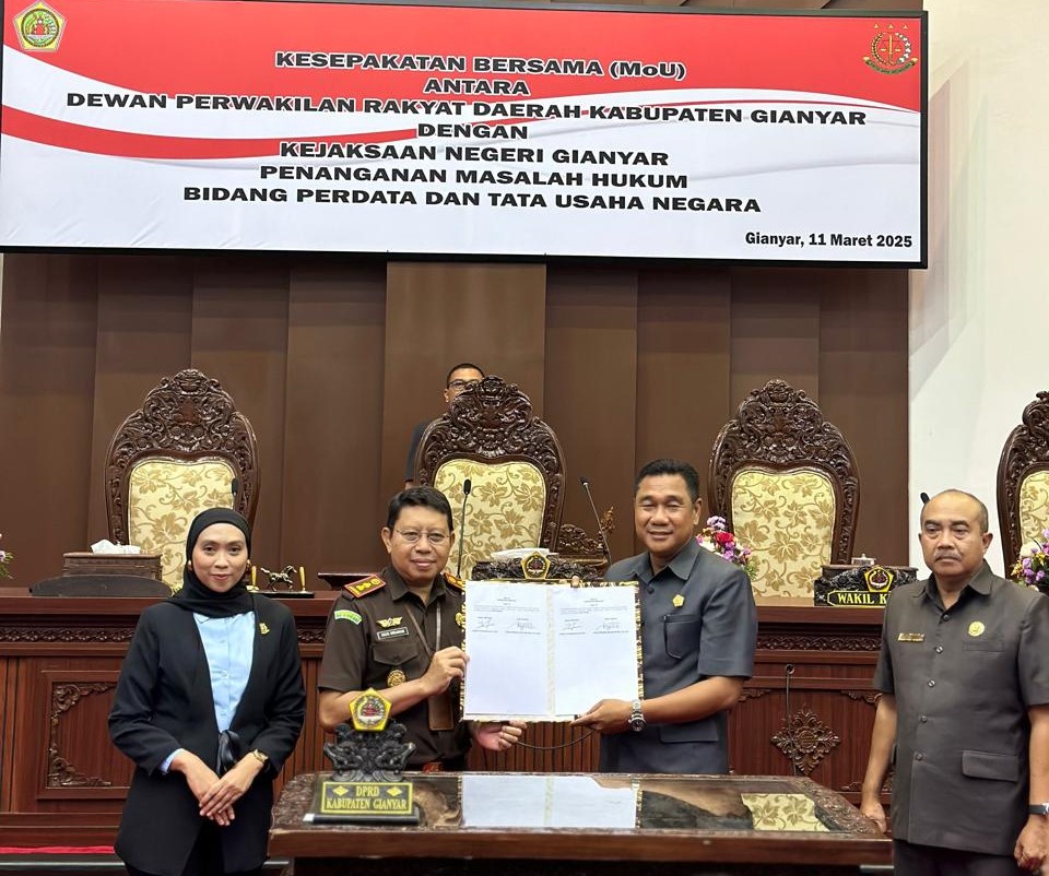 Gianyar – Kejaksaan Negeri Gianyar bersama Dewan Perwakilan Rakyat Daerah (DPRD) Kabupaten Gianyar menandatangani nota kesepahaman (MoU) terkait penanganan permasalahan hukum dalam bidang perdata dan tata usaha negara bertempat di Ruang Sidang DPRD Gianyar, Selasa (11/3/2025).